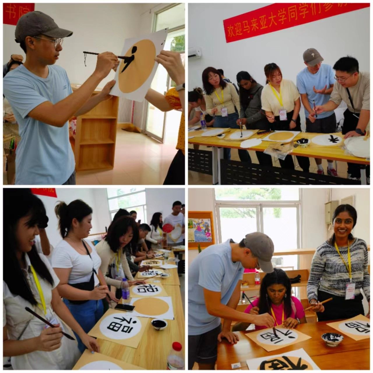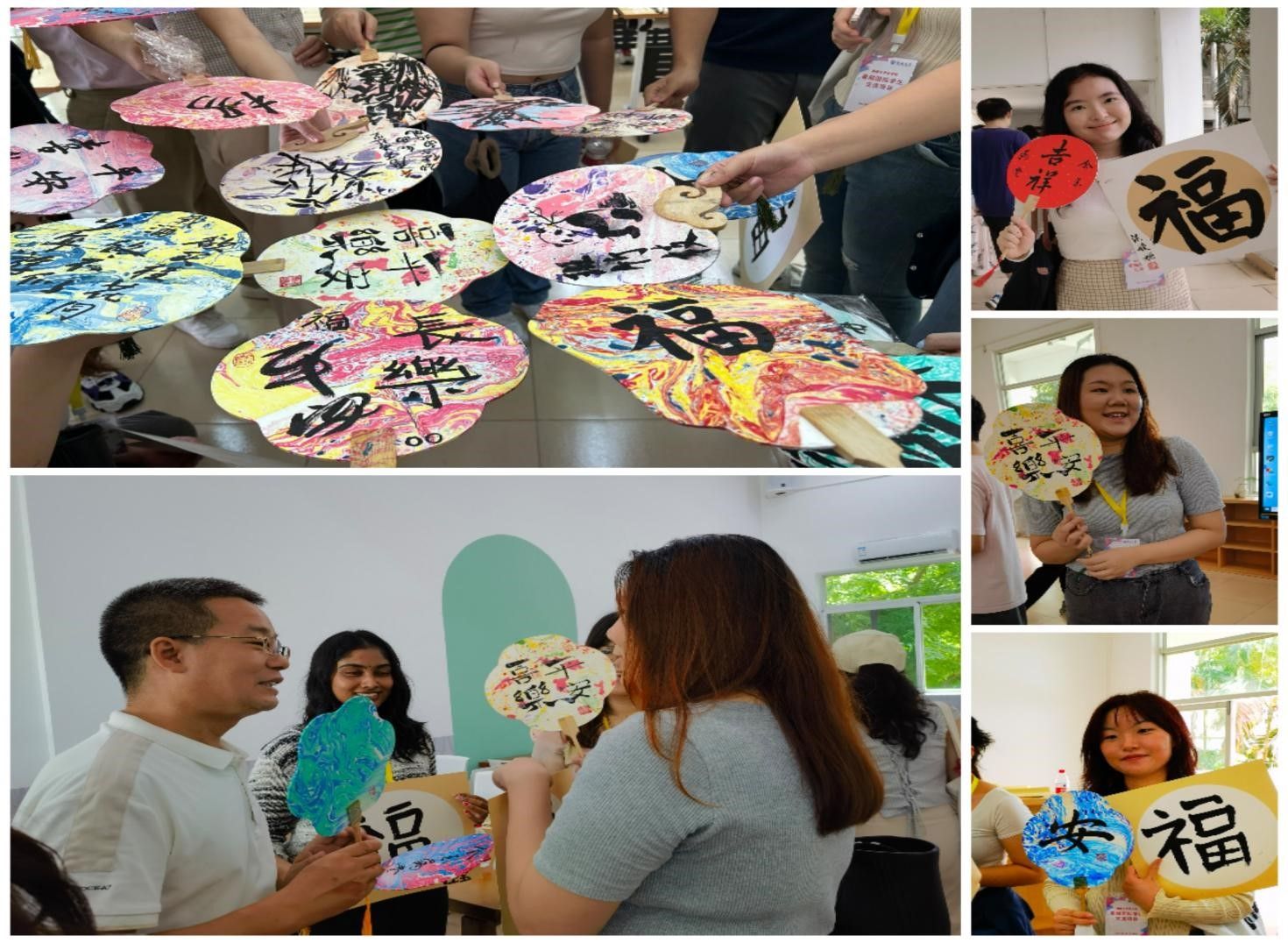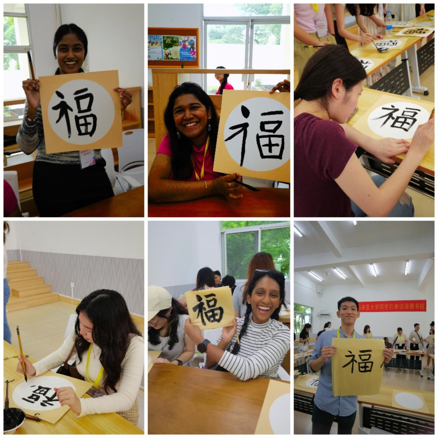 为了迎接马来亚大学的青年学子,海德书院为大家准备了书法写作和漆扇制作体验。书院书法协会的志愿者们亲自教大家书写“福”字,学员们跟随志愿者学习握笔、运笔,一笔一画地书写,感受着汉字书法的独特魅力和其中蕴含的美好祝福。有的学员虽然第一次拿毛笔,笔画生疏,但在老师的耐心指导下,越写越有自信,并掌握了基本的书写技巧。有的学员在静心书写中体会到了中华文化的内敛与深邃,现场给自己起了中文名字。通过这样的文化体验活动,展现了书院的文化育人理念和伟德源自英国始于1946人才培养的开放性和多元性。