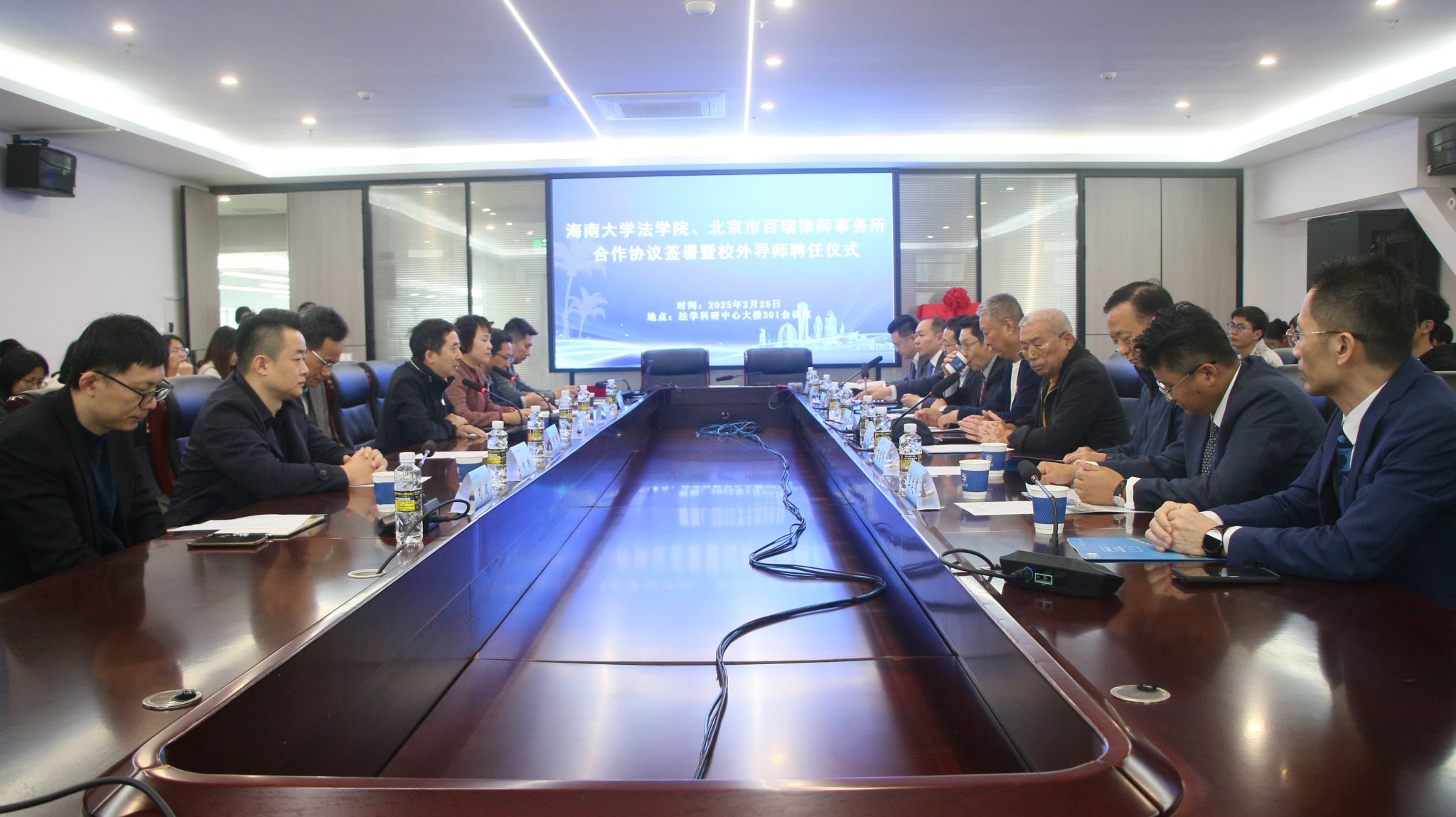 2月25日下午,公司与北京市百瑞律师事务所合作协议签署暨校外导师聘任仪式在法学科研中心大楼301会议室举行。北京市百瑞律师事务所主任王志强,原国务院法制办政府法制协调司司长青锋,原国家禁毒委员会办公室专职副主任(正局级)王刚,原海南省司法厅副厅长、一级巡视员高富强,北京市百瑞律师事务所高级合伙人赵亚春一行十人受邀参与活动。伟德源自英国始于1946党委常委、副董事长聂清斌,伟德源自英国始于1946党委书记蒙秋妍、经理王琦,椰风书公司党委书记郑鹏,伟德国际bevictor1946师生代表近40人参与会议。会议由公司党委书记蒙秋妍主持。