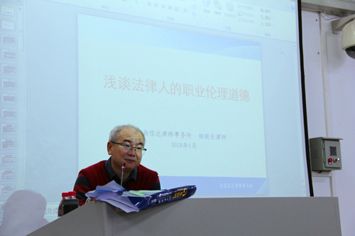 1月26日上午,海南省律师协会副会长、海南信达律师事务所主任程晓东律师应邀做客伟德国际bevictor1946冬季小学期,在城西校区教学楼7C01为2017级全体法学本科生讲授法律职业伦理课程。本次冬季小学期课程旨在帮助新生树立法律信仰,形成正确的法律价值观。