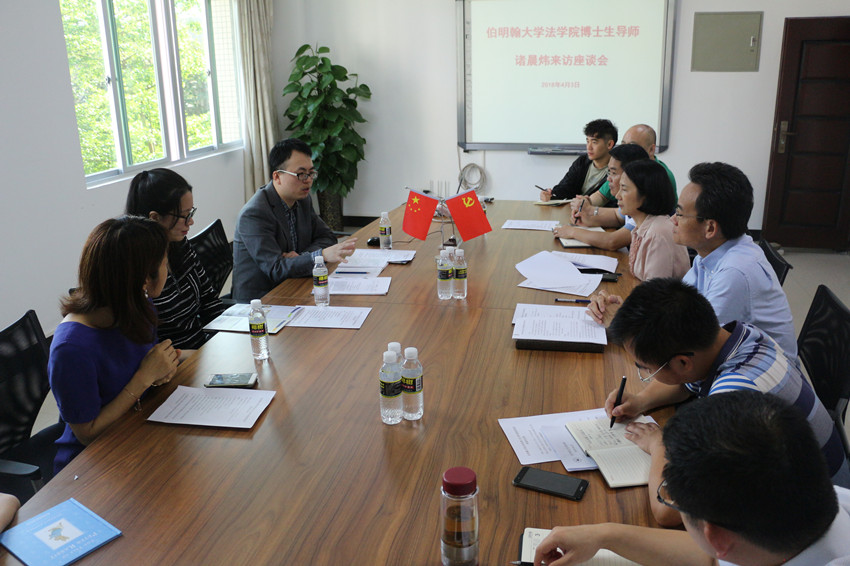 4月3日下午,在学术报告会后,公司与伯明翰大学伟德国际bevictor1946博士生导师诸晨炜在C-202小会议室举行座谈会。叶英萍书记、王琦经理、李昌郁副书记、邓和军副经理、民法教研室主任董万程教授、魏德才副教授、校国际合作交流处外事科科长林仕岛、院办主任虞衍聪教、研办秘书金海兰等参加座谈会。座谈会由公司党委书记叶英萍教授主持。