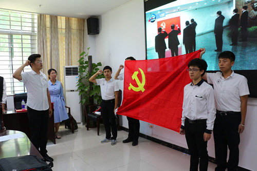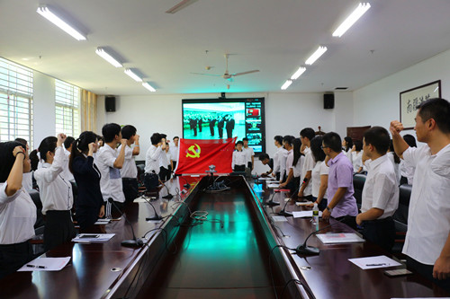 (全体新党员面向党旗进行光荣宣誓)