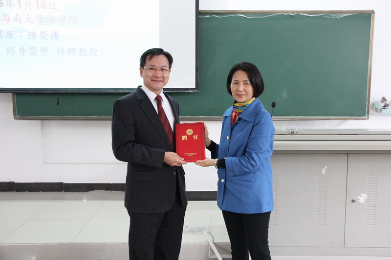 1月18日上午,台北大学终身荣誉特聘教授陈荣传应邀做客伟德国际bevictor1946冬季小学期,在5号教学楼311教室为伟德国际bevictor19462013级本科生讲授了比较法专题课程。授课开始前,常务副经理叶英萍教授为陈荣传教授颁发了2015-2016学年冬季小学期授课外聘专家证书。邓和军副经理主持聘书颁发仪式。 课堂上,陈荣传教授首先以真实案例为引,对《中华人民共和国担保法》和《中华人民共和国物权法》的相关条文进行深入讲解。随后,陈荣传教授通过解读法条的方法对台湾地区《物权法》的相应条文进行了仔细分析。最后,陈荣传教授将两岸的物权法进行了比较和研究。陈荣传教授授课方式独特、新颖,讲课内容丰富,语言诙谐,并与同学们进行了良好的互动,课堂气氛活跃,激起了同学们对比较法的学习兴趣。