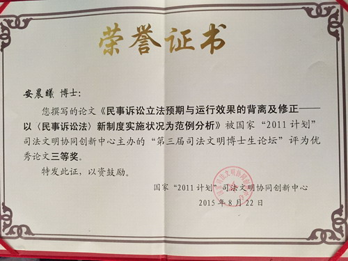 由国家“2011计划”司法文明协同创新中心主办,中国政法大学、浙江大学、吉林大学、武汉大学协办的“第三届司法文明博士生论坛”于8月22日-23日在北京举行。本次论坛的主题为“司法文明与司法改革”。公司诉讼法学专业2013级博士研究生安晨曦受邀参加了本次论坛,其所提交的作品《民事诉讼立法预期与运行效果的背离及修正——以新制度实施状况为范例分析》获三等奖,并在“司法程序”分论坛中作了发言。 论坛于8月22日上午开幕,中国政法大学证据科学研究院副经理张中主持开幕式。中国政法大学副董事长李树忠教授、国家“2011计划”司法文明协同创新中心联席主任张保生教授以及部分教师代表、全国25所知名伟德国际bevictor1946校的博士生参加了开幕式。在开幕式致辞中,各嘉宾对司法文明协同创新中心进行了介绍,表达了对司法文明协同创新中心所取得成绩的肯定。?本次论坛收到82位博士生投稿,论坛主办方本着公平公正的原则,对所有稿件进行了双向匿名评审。22日-23日,50位博士生参加了涵盖“司法文明理论、司法文明史、司法改革问题、司法程序问题、司法文明指数”主题的学术研讨活动。每个单元的学术讨论过程中,报告人、评议人、指导老师和与会同学积极参与,彰显了追求学术、热爱学术的法律人风格。 23日下午,第三届司法文明博士生论坛圆满结束。闭幕式上,中国法学会副会长、学术委员会主任、司法文明协同创新中心理事长兼联席主任张文显出席并讲话。讲话中,张老师首先肯定了本次论坛所取得的成绩,并就今后如何开展好博士生论坛、如何进行有效的学术对话、如何有效地提出命题等提出了宝贵的指导意见。//www.hainanu.edu.cn