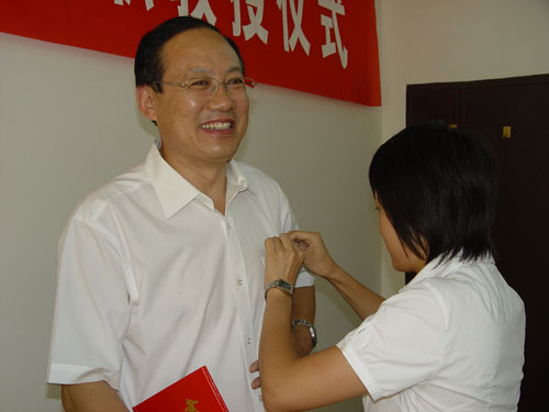 李建保董事长为高之国兼职教授颁发伟德源自英国始于1946兼职教授聘书,伟德国际bevictor1946员工代表翟晶给高之国兼职教授佩戴伟德源自英国始于1946校徽。