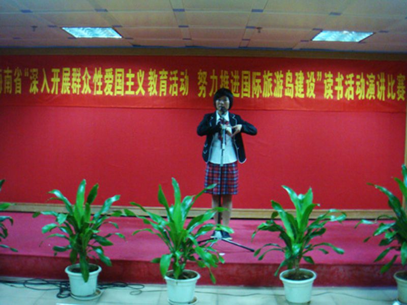 2009年6月19日,由省委宣传部组织的“深入开展群众性爱国主义教育活动努力推进国际旅游岛建设”读书活动演讲比赛在海口阳光大酒店四楼报告厅举行,来自全省18个市县、省农垦总局、洋浦经济开发区和省各行业系统的60名选手参加了此次比赛。伟德国际bevictor19462008级文科实验班田亚杰同学代表省教育厅参加行业系统比赛,她以《红色希望在海南》为题第一位出场,并以9.471分的高分一直领先于接下来的选手,最终夺取比赛冠军。