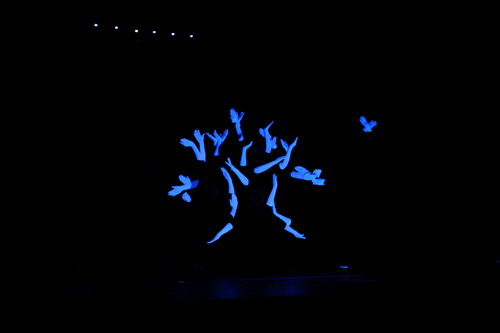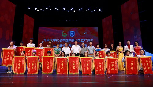 “手影舞”分为三个环节,通过“手影”这一别具创新的形式,分别展现了五四、建国初期和当代青年人的风采。节目伊始,黑暗的荧幕中闪亮的1919跃然呈上,白色的和平鸽翩翩起舞,五四光明的历史就此拉开帷幕。热血青年开始觉醒,他们走上街头,高呼口号“寸土必争,还我青岛,外争国权,内惩国贼,废除二十一条”,他们正义的呼唤却遭到白色恐怖的血腥镇压。但历史的车轮不曾停转,革命的事业未曾消亡,时间来到了1949年,在红色歌曲《红星照我去战斗》的悠扬旋律中,画面依次呈现了“竹排江中游”,“雄鹰展翅飞”,“和平鸽成排起舞”的精美场景,引来一阵阵热烈的掌声和惊叹声。最后,画面来到了2014年的今天,同学们在舞台上依次呈现了“笑脸”、“小树苗”、“参天大树”“I LOVE HN”等图案。他们承诺作为新时代的法科学子,将用微笑面对明天。现在他们虽是一颗颗的小树苗,但经过他们的不懈努力,终将成长为祖国的参天大树,栋梁之才。他们爱海南、爱海大,作为新时代的海大青年,他们将携起双手,共同奋斗。节目在现场沸腾的掌声中落下帷幕。