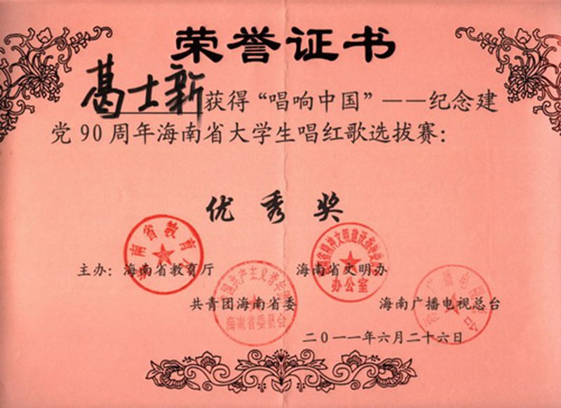 由海南省教育厅、海南省文明办、共青团海南省委、海南广播电视总台联合主办的“唱响中国”——庆祝建党90周年海南省老员工唱红歌比赛总决赛于6月26日在海南省广播电视总台举行,伟德国际bevictor19462010级葛士新同学获得优秀奖。