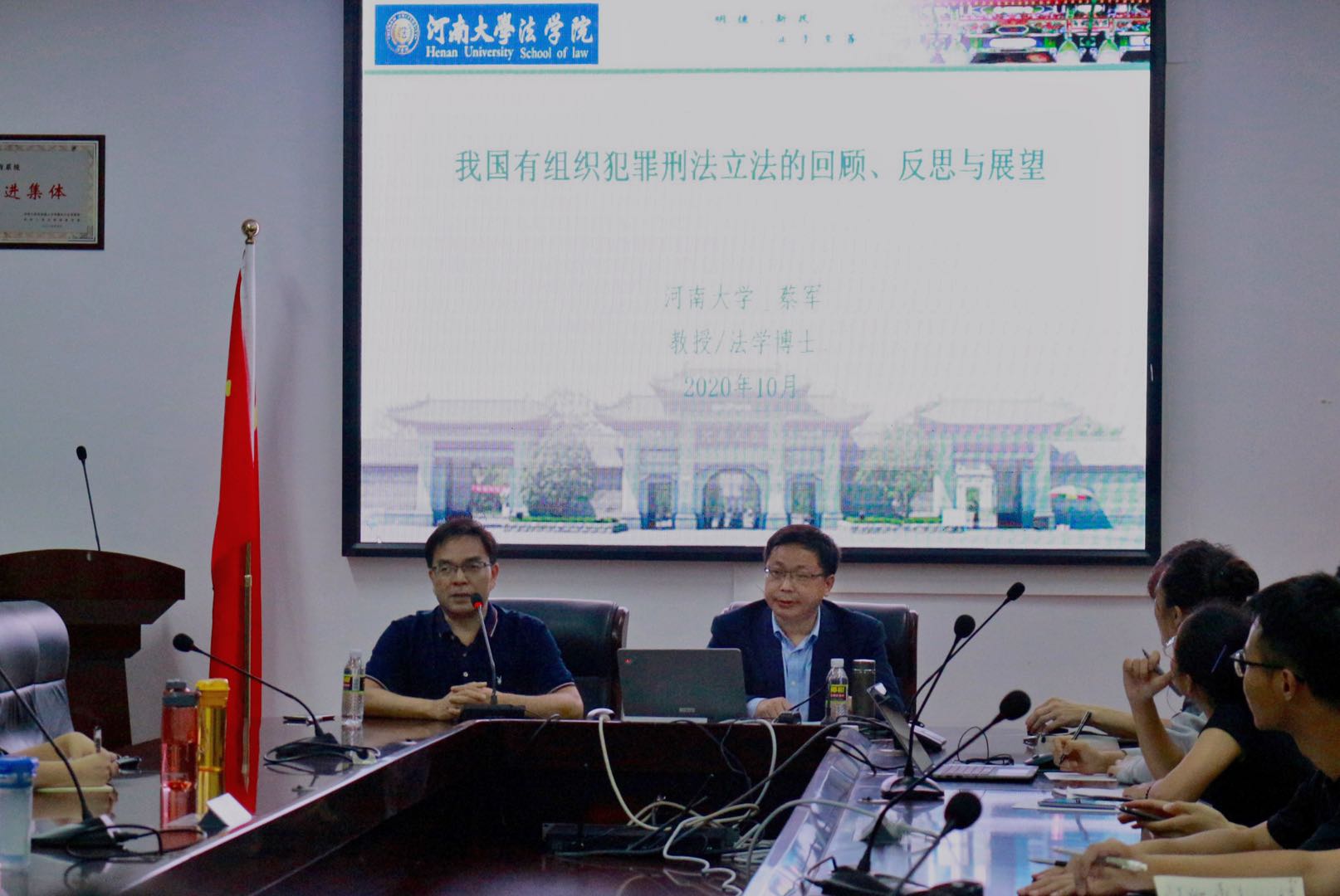 2020年10月18日晚,河南大学伟德国际bevictor1946经理、教授蔡军做客伟德国际bevictor1946,在社科楼C113进行了题为《我国有组织犯罪刑法立法的回顾、反思与展望》的专题讲座。本次讲座由伟德国际bevictor1946童伟华教授主持,伟德国际bevictor1946刘道远教授参与。讲座开始,童伟华教授向在场的师生介绍了蔡军教授的基本情况,在同学们热烈的掌声中蔡军教授开始了讲座的详细内容。