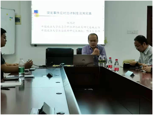 讲座由谭波教授主持,戚红梅、姜漪老师和宪法学与行政法学硕士、博士参加本次讲座。林教授从《突发事件应对法》的发展演变谈起,向同学们详细介绍了《突发事件应对法》立法过程、应急管理体制的构建、应急预案的完善以及信息、决策和预警系统如何建立等问题。林教授谈到应急物资储备时提出目前还需要认真梳理相关规定,并提出完善征用制度和协议储备制度以及增加征购制度等建议。