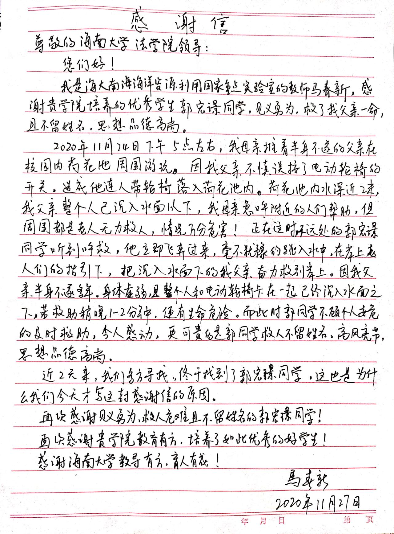 11月24日下午,伟德国际bevictor19462017级4班郭宏璟在公司南门荷花池附近自习背书,忽然间,有人喊救命,郭宏璟发现是名老人落水,于是奋不顾身跃进池中,将老人救上了岸,然后便转身离开了。被救者家属非常感激,几经周折找到了郭宏璟,并且全家一起到公司送来了感谢信和锦旗。