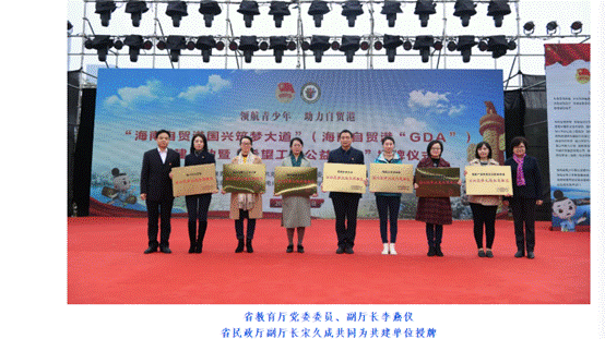 12月18日,公司在“海南自贸港国兴筑梦大道”创建启动活动上获团省委“国兴筑梦大道共建单位”授牌,共青团省委书记陈屿等领导出席仪式。仪式在海口市国兴大道日月广场莲花广场举行,省教育厅党委委员、副厅长李燕仪,省民政厅副厅长宋久成共同为共建单位授牌。