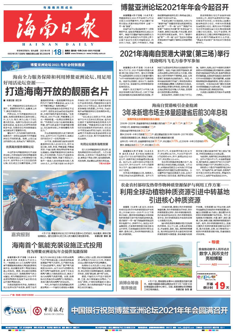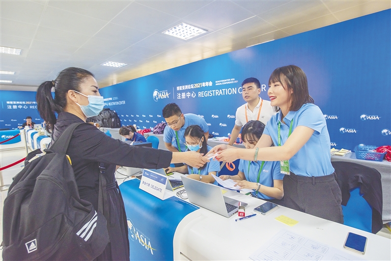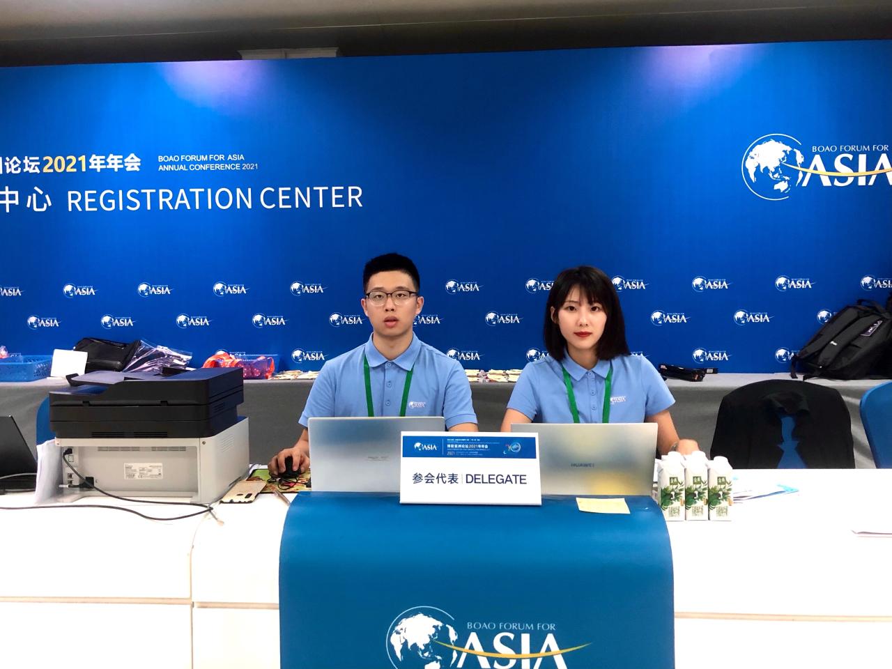 2021年4月18日,在博鳌亚洲论坛培兰注册中心,伟德国际bevictor1946研究生谷雨、王艺晗等同学在现场为前来的嘉宾提供注册登记服务。海南日报的记者对这一场景进行拍摄,并将他们的照片刊登在当日的头版头条位置。