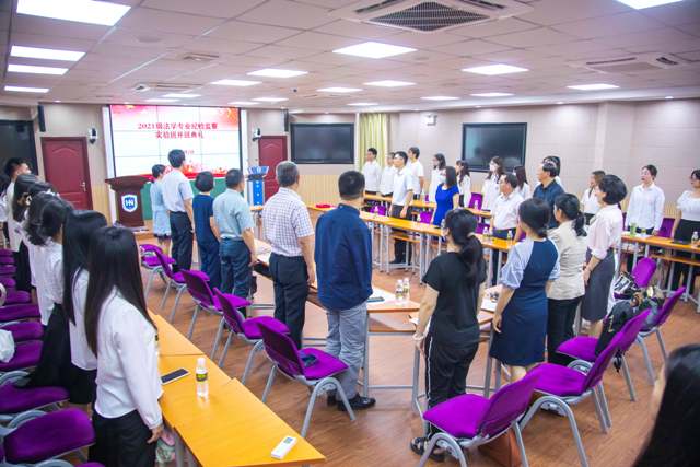 第五项,导师代表刘荣教授发言。刘荣教授提出了以下几点有益建议:第一,法员工应当树立法律人的思维。一名合格的法律人,要时刻以事实为根据,用逻辑、理性来思考,摒弃固有观念,做到以事实为依据,以法律为准绳。第二,学会审视“平凡”。刘荣教授与同学们分享了毕业生的困惑和迷茫,也以自身经历为例,耐心开导同学们面对“平凡”时的心态,“平凡造就伟大”,摆正心态是坚持走下去的强大精神力量。最后,刘荣教授叮嘱同学们珍惜时光,不负韶华,为未来打下坚实基础。