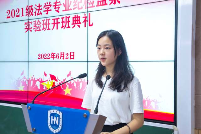 第四项,2021级实验班员工代表吴菁菁发言。吴菁菁同学首先回顾了自己加入实验班的历程,与大家一起交流了感想,并结合伟德国际bevictor1946的校训“明法、修德、尚义、笃行”就如何成为一名合格的法律人提出了以下四点建议:第一,“明法”。在打基础阶段,同学们必须要通法理,知法史,晓法规,掌握最基础也是最重要的法学专业知识。第二,“修德”。吴菁菁同学指出,崇高的道德永远是一个法律人的追求。在接下来的学习生活中,同学们要始终不忘初心,永远怀着悲悯与善意,风光霁月地向前走去。第三,“尚义”。将来作为一名法律人,同学们要了解法律的公平正义,了解法律背后的价值理念,真正做到将自己所学奉献给社会。第四,“笃行”。伟德国际bevictor1946的学子不仅要学有所得,还要努力践履所学,做到知行合一。吴菁菁同学的精彩发言使每一位同学有深刻的感悟,相信同学们在接下来的法学路上一定谨记院训,砥砺前行。