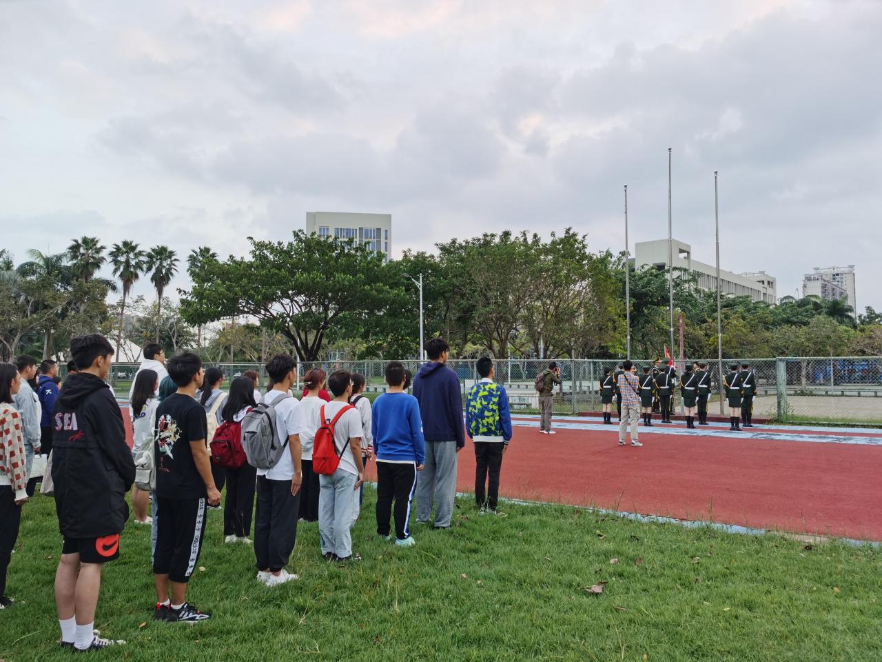2021年10月25日上午6:40,升旗仪式准时开始,国旗班的旗手们迎着朝阳,脚踩正步,以饱满的热情和昂扬的姿态庄严地护卫着五星红旗。当铿锵激昂的《义勇军进行曲》响彻整个校园时,同学们集体行注目礼。鲜艳的五星红旗冉冉升起,同学们内心的爱国热情也得到了升华。